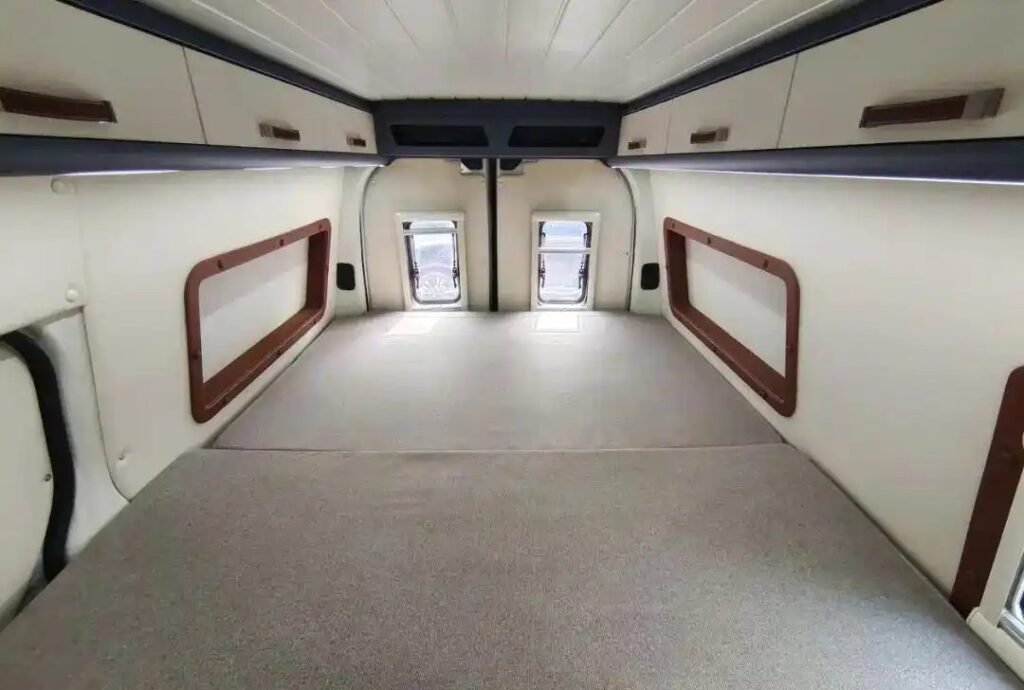 At the rear, a transverse bed measuring 2m long × 1.7m wide comfortably accommodates three people. Beneath lies a massive storage compartment perfect for outdoor equipment, tools, and portable water tanks.