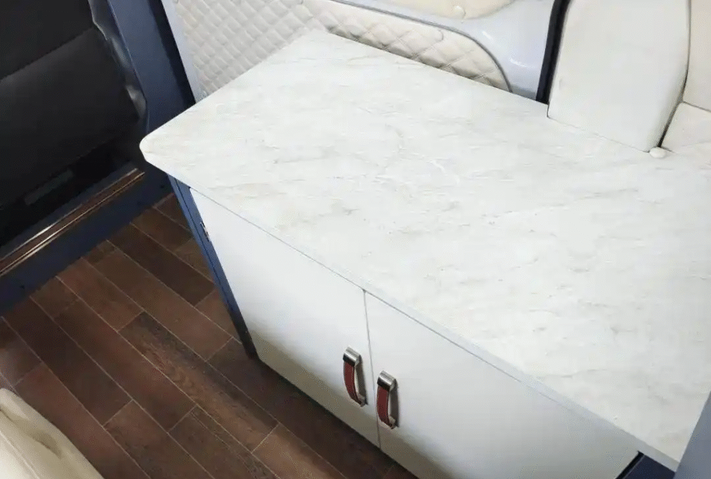 The mid-section incorporates a practical mini-bar that serves as a compact kitchen, complemented by generous under-counter storage for utensils and camping gear.