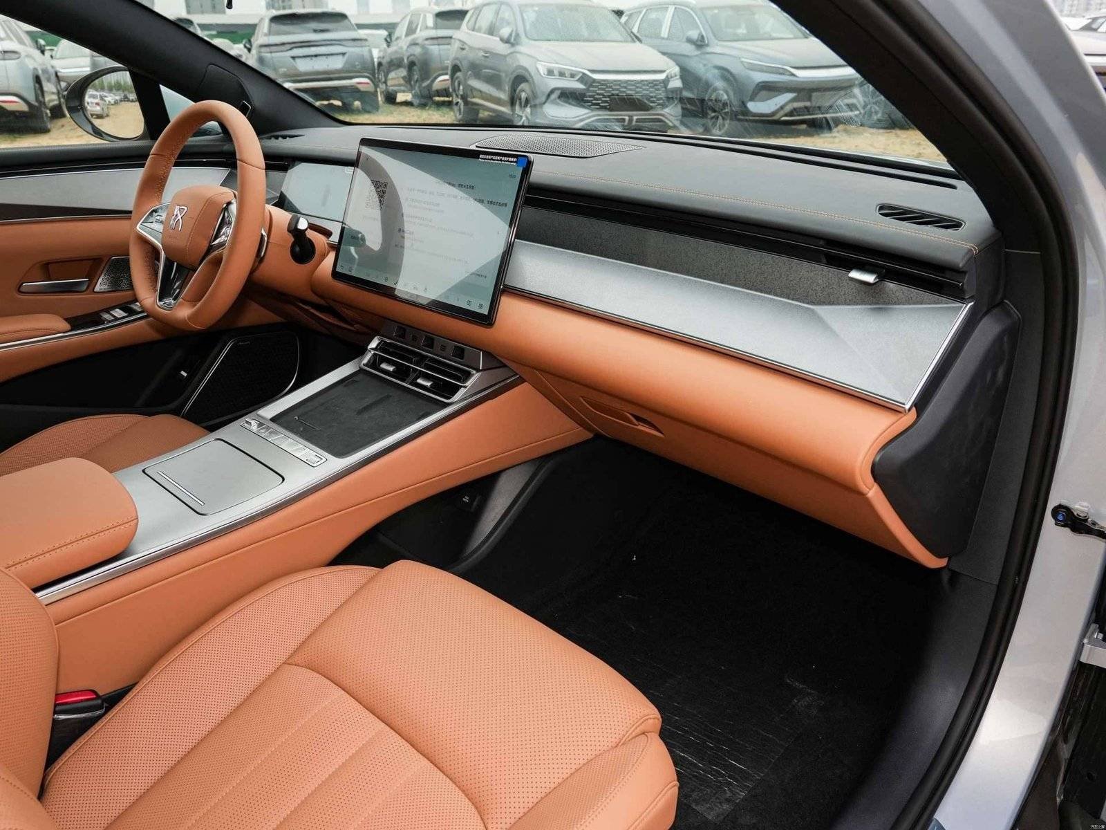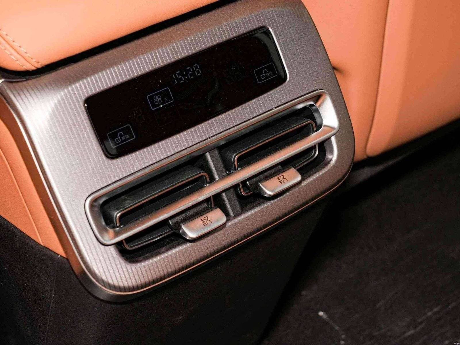 The BYD Han L DM retains the familiar floating central control screen combined with a digital instrument cluster, available in two color schemes: brown and white. The central control panel features a cut-out design formed by the integration of bamboo wood trim, while retaining some physical buttons.