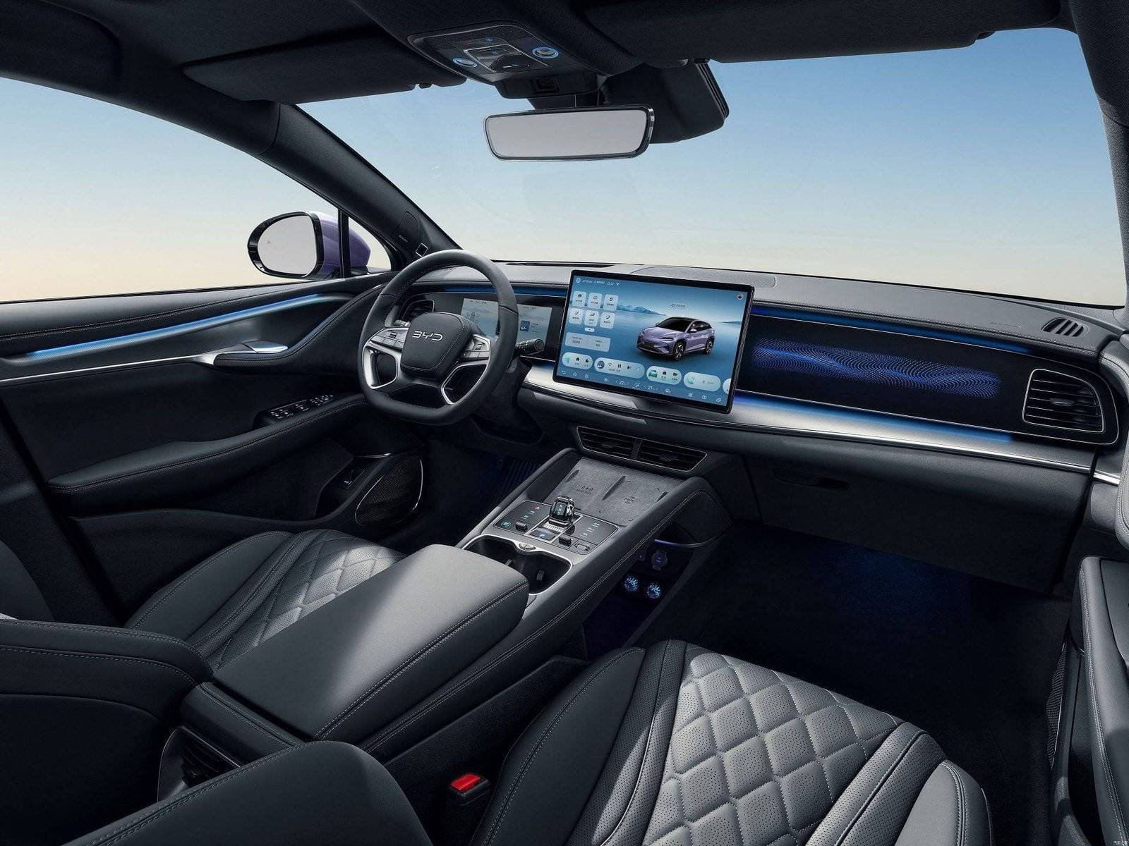 Inside, the Sealion 07 EV offers a spacious and comfortable ride. The overall design is simple and modern, with extensive use of soft materials and exquisite stitching work to enhance the sense of luxury inside the vehicle. The center console is equipped with a large touch screen that supports the Smart Connect system, providing drivers with a wealth of infotainment features.