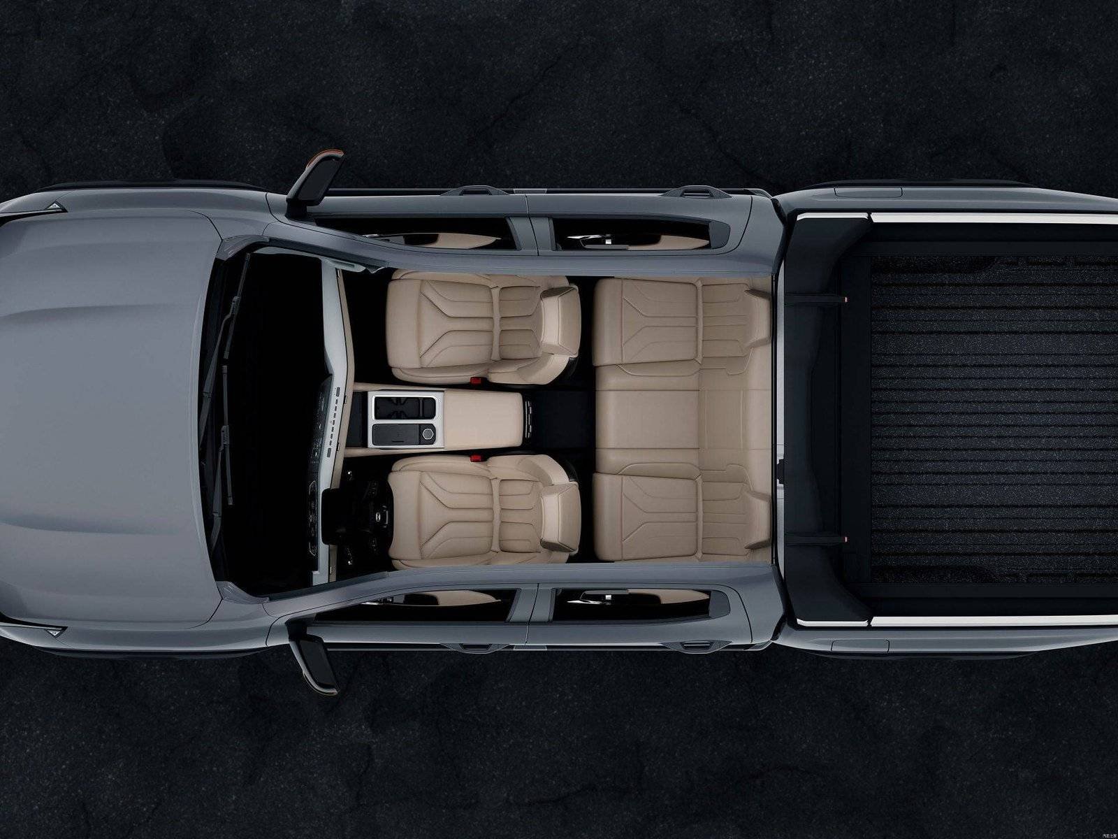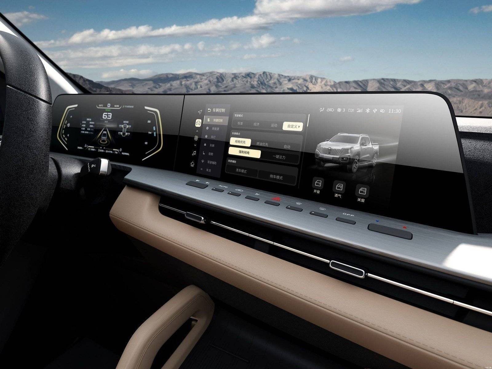 The interior features a wrap-around cabin and colorblocking design with a 12.3-inch integrated dual-link screen, which is designed with an 8.°curvature and is slightly biased to the side ofthe main driver’s seat.The vehicle system is deeply customized with exclusive functions for pickup trucksand equipped with an 8-core MT8666 chip, which can achieve 2 trilion neural calculations per second,creating a strong technological atmosphere,inaddition, the interior alo adopts a penetrating air conditioning vents and pocket gear design, which enhances the interior texture and drivingcomfort.