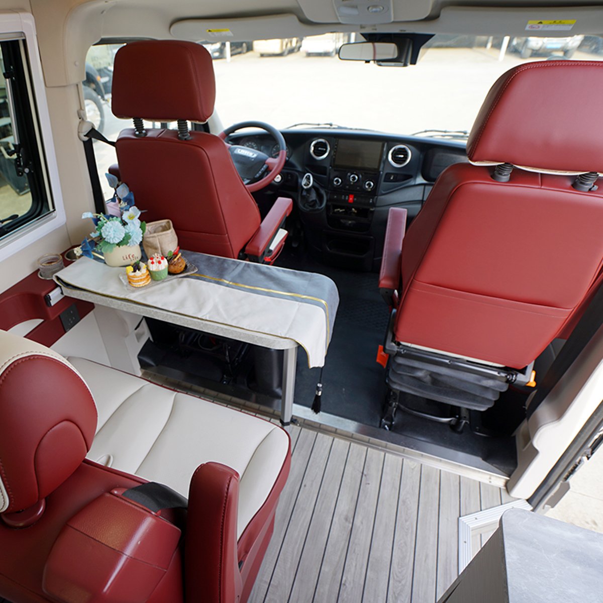 | Furniture and Interior Design | Driver and passenger seats in the cab, double dinette, rear extension, movable table, cabinets, kitchen cabinets, overhead cabinets, front cabin covering, Interior upholstery, wear-resistant floor mats |