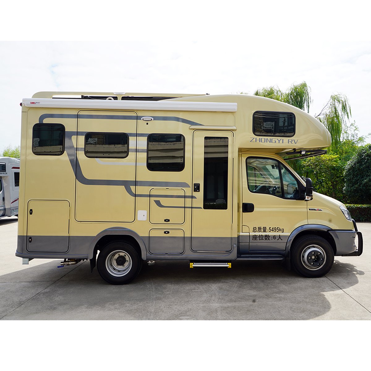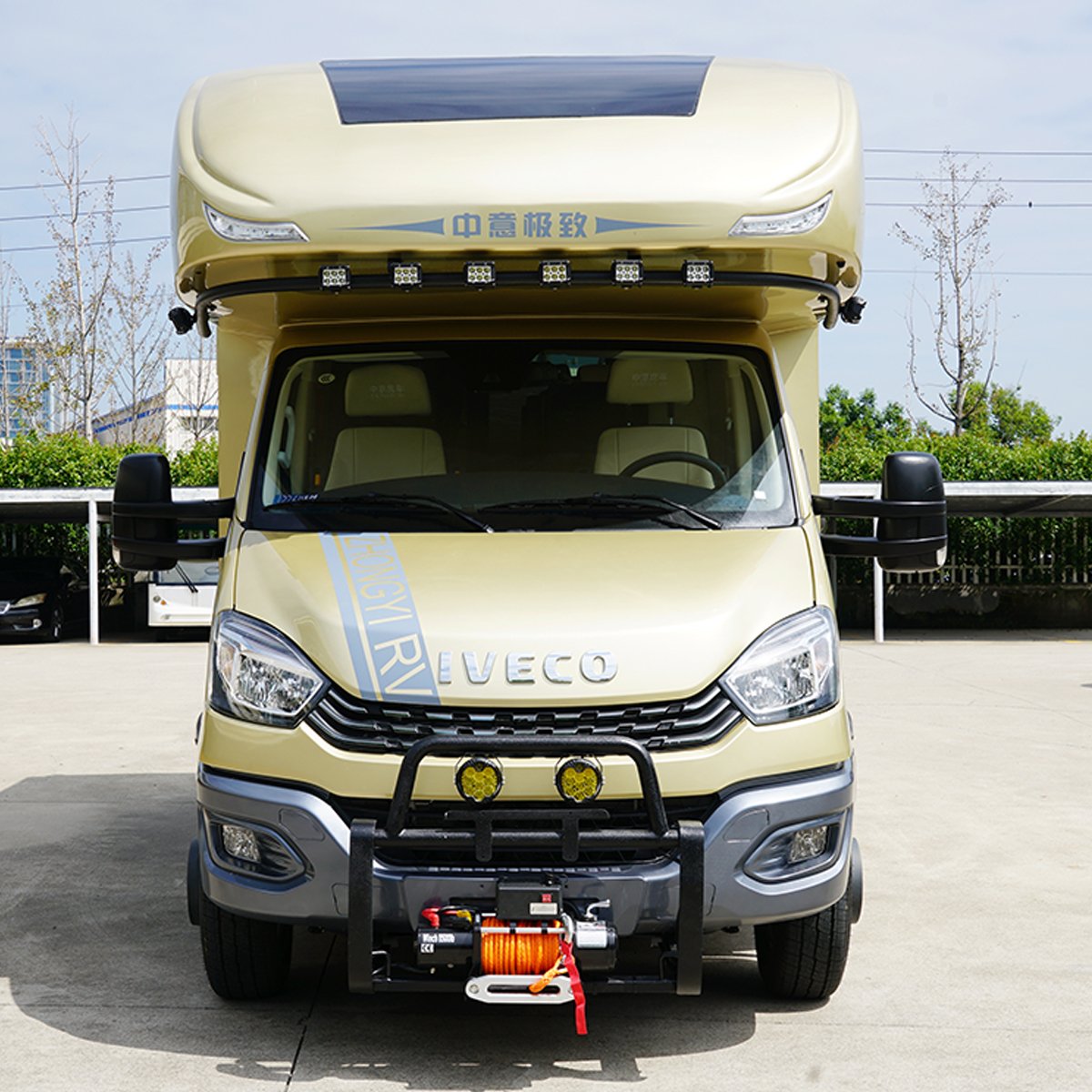 | Body structure and accessories | Iveco Daily 6.5-ton chassis, driver and passenger doors, middle door, driver and passenger power windows, outward-opening windows, right side door. Side skirt storage cabinets, left side skirt storage cabinet, large rear storage cabinet, left side extension compartment , rear extension compartment. The right side features a retractable toilet, awning, 660W solar panel, and four-channel surveillance. |