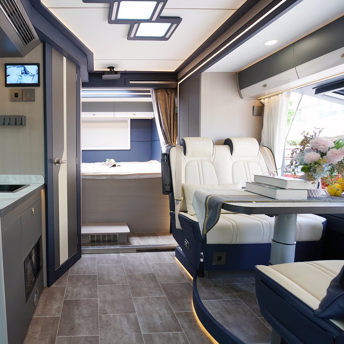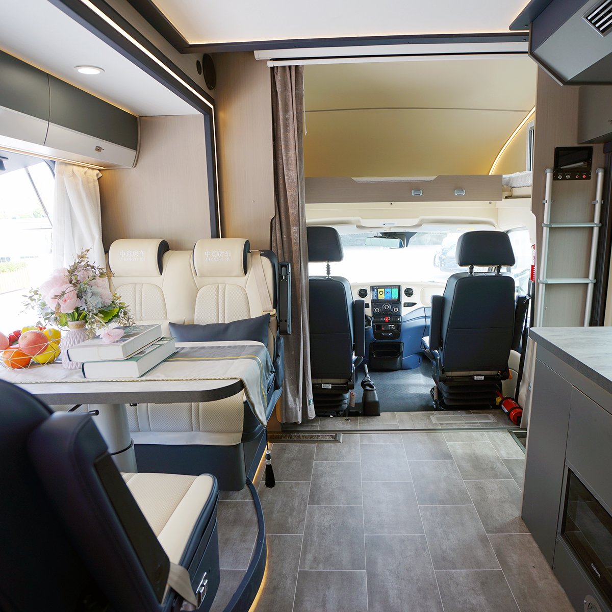 Inside, comfort meets innovation. With sleeping areas including a front overhead bed and a rear expanded bed, along with a versatile face-to-face sofa setup, the interior comfortably accommodates up to six people. A patented retractable bathroom design significantly enlarges the shower space, enhancing everyday convenience.